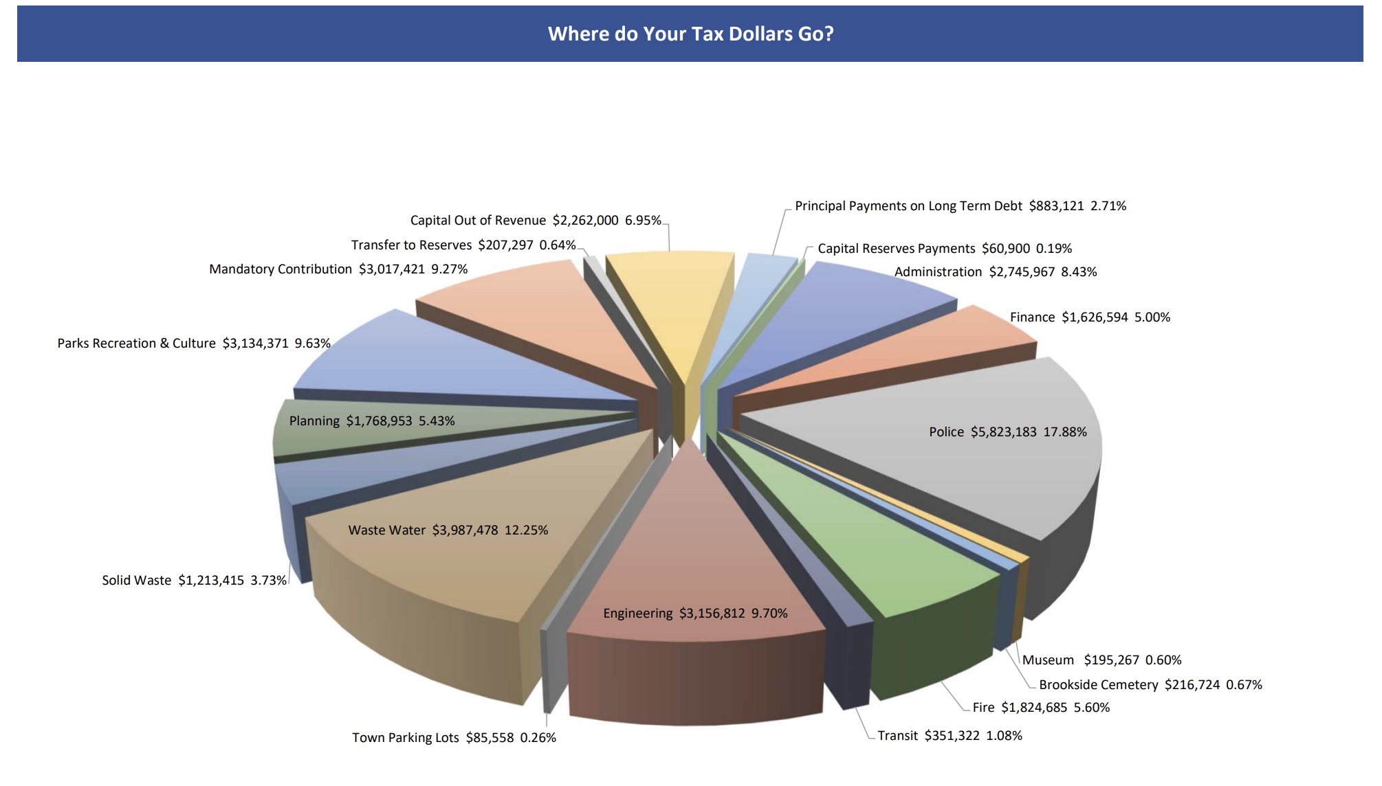 A pie chart showing Bridgewaters budget for the upcoming year. PHOTO: TOWN OF BRIDGEWATER/COUNCIL DOCUMENTS