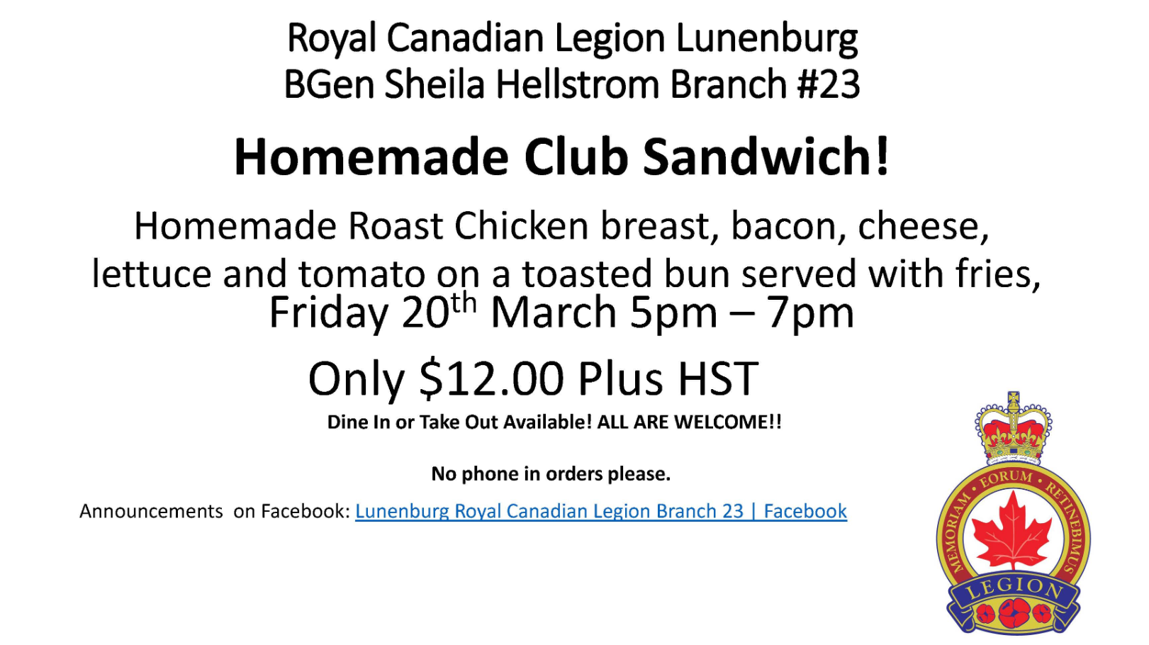 Royal Canadian Legion Lunenburg has homemade Clubhouse sandwiches with fries for only $12 this Friday 20th March from 5pm - 7pm. Everyone is welcome! Eat-in or take-out available! Come out and support your local legion.