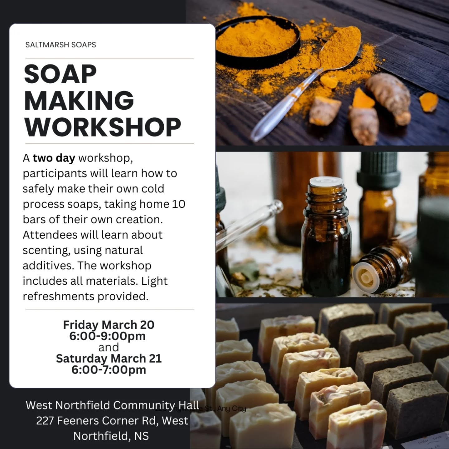 Saltmarsh Soaps are offering a Soap Making Workshop Gather at the West Northfield Community Centre Friday and Saturday March 20&21 for an immersive 2 day, hands on workshop! Participants will learn everything needed to make cold processed soap at home, and take home 10 bars of their own creation made during the workshop. Light refreshments […]